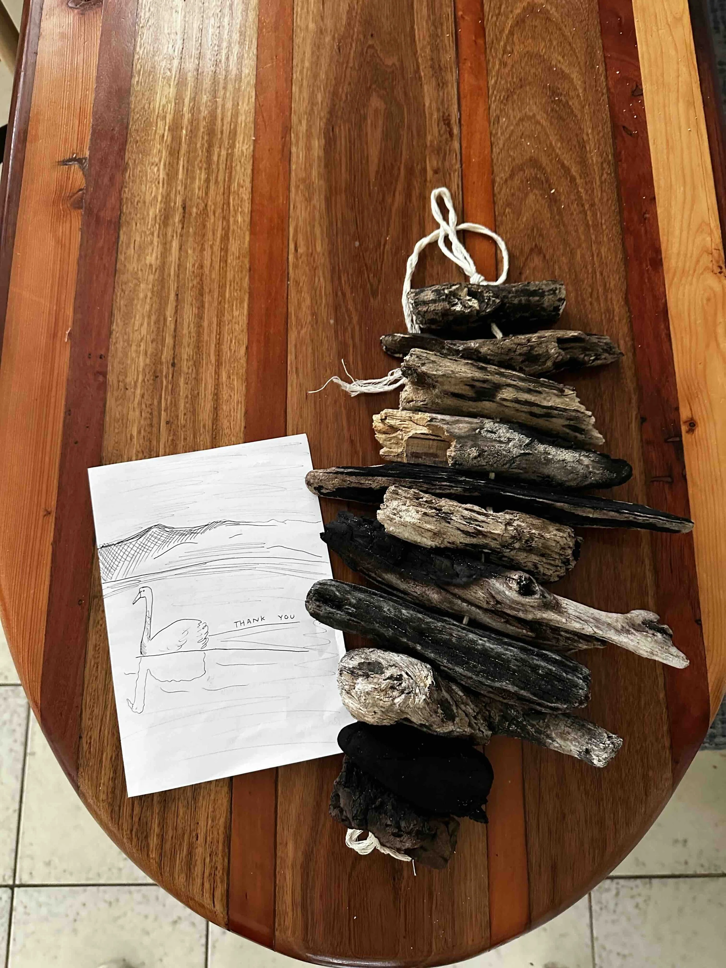 I wrote the hosts a thank you card, the kids and moms all signed it and we left it behind to say thanks alongside this driftwood wall hanging we all made