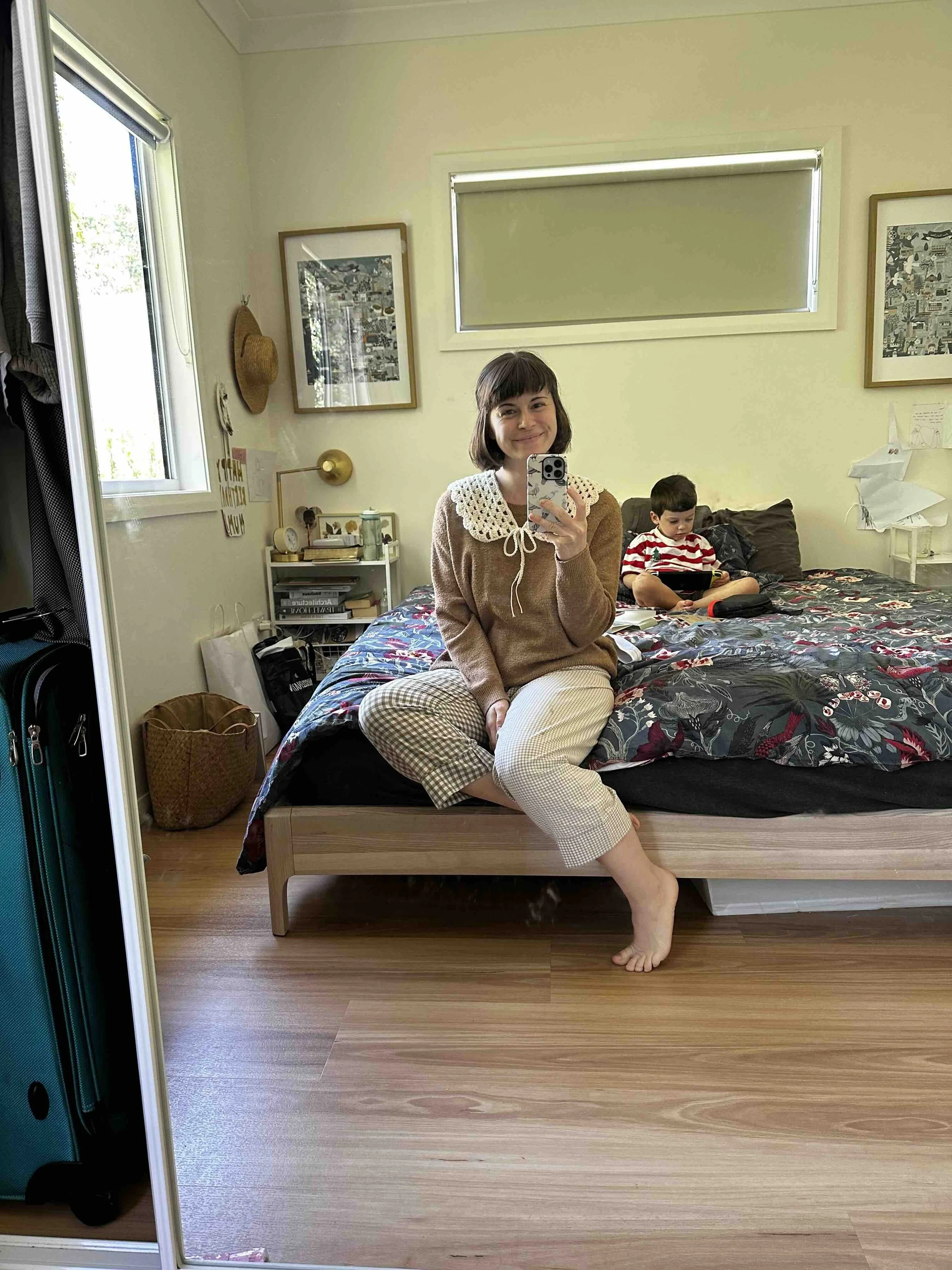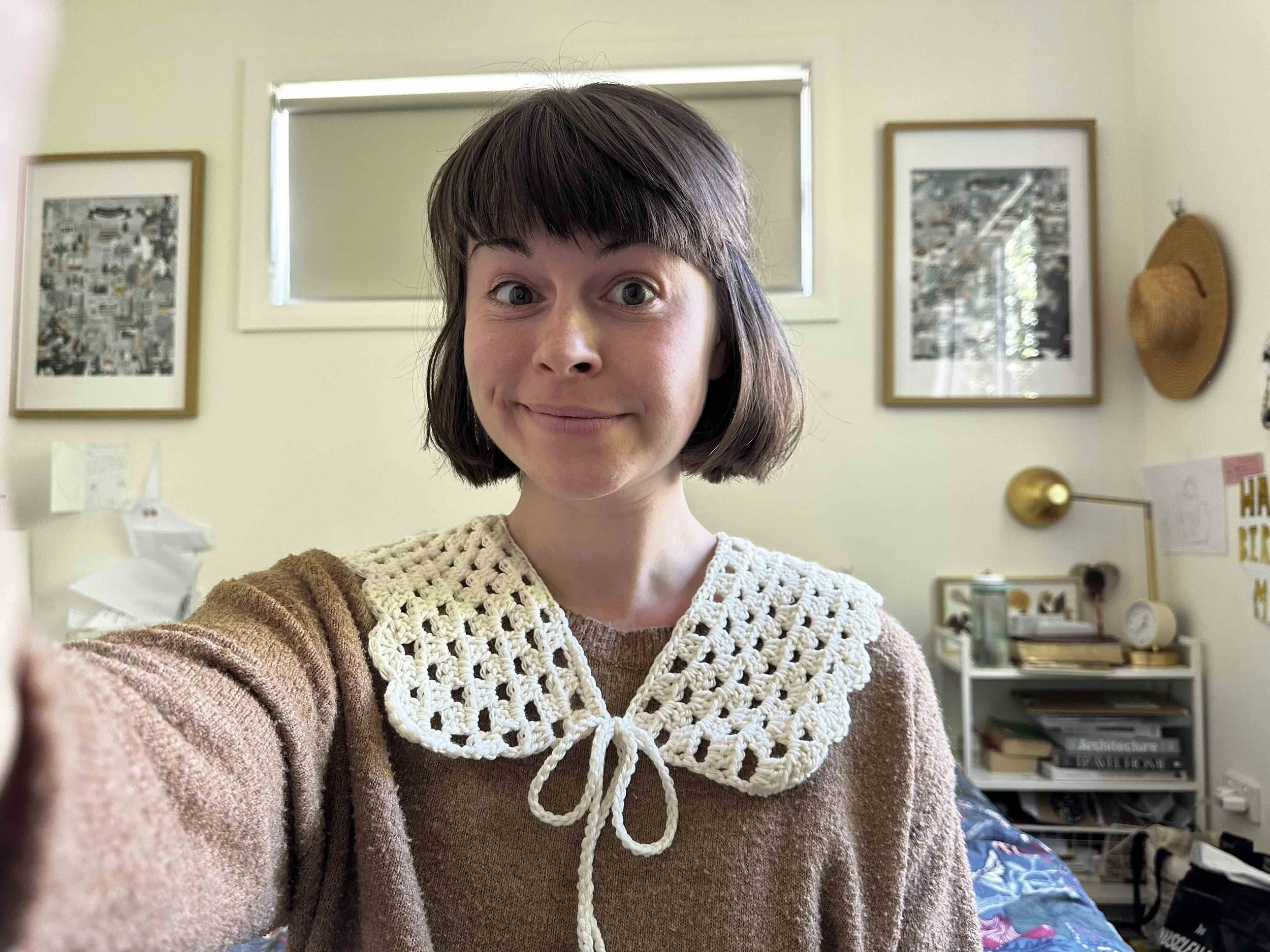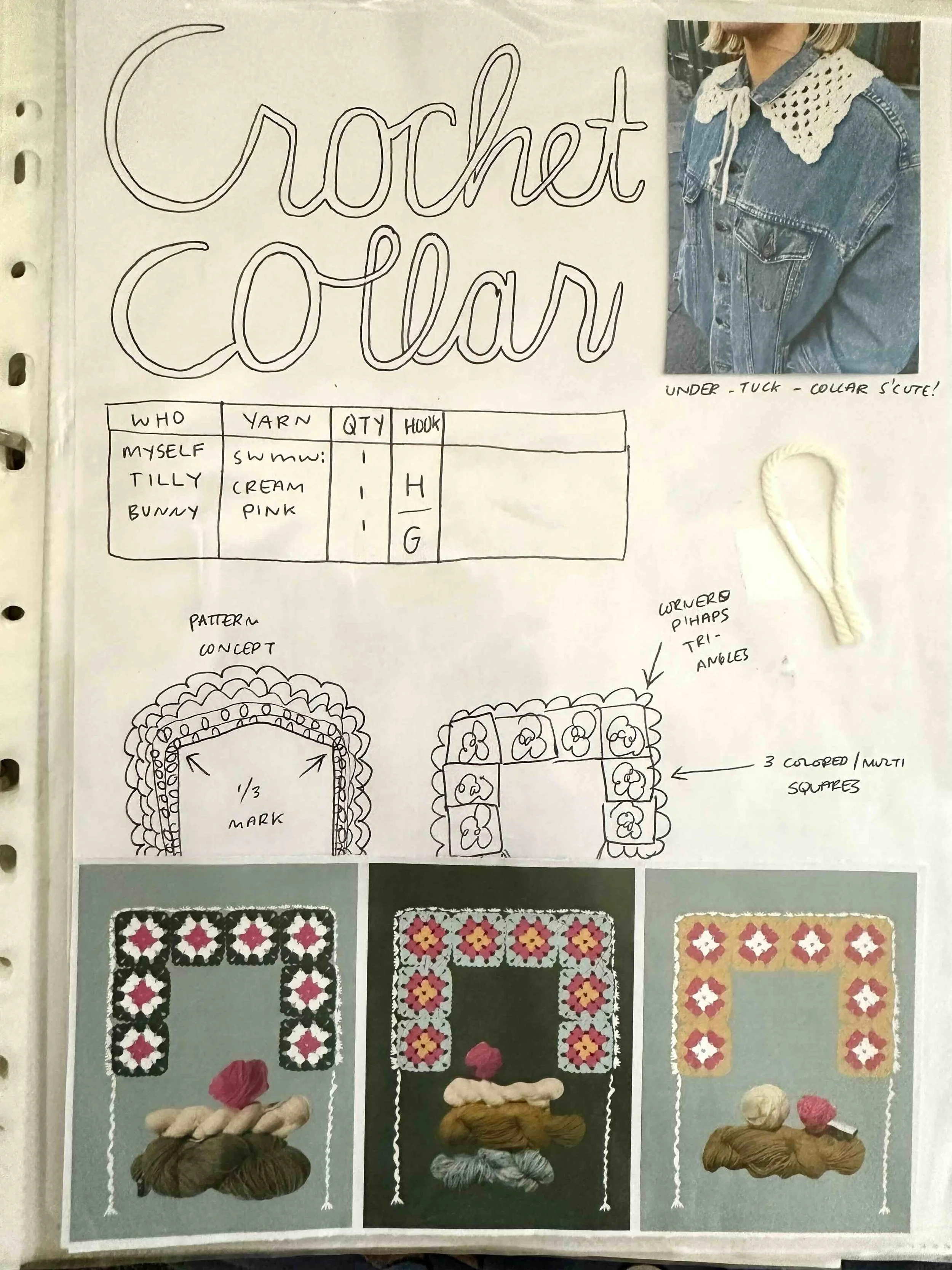 Since we didn’t actually construct a shell “found object” wall hanging, I’m still keeping that brief at the front of my project binder so I can complete it at home. But I did complete a different brief while we were on our trip, I made Matilda and myself some very cute crochet collars.