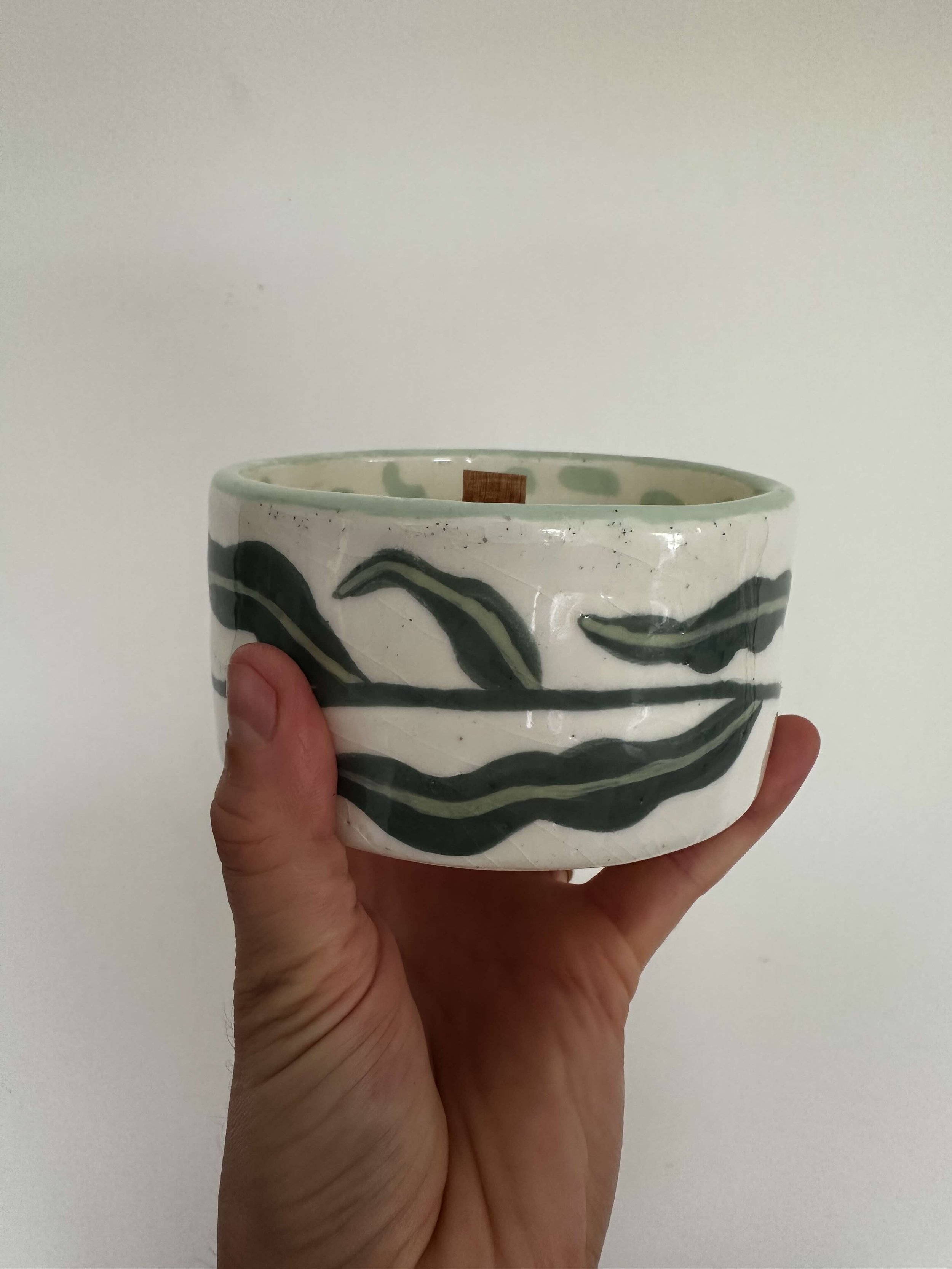 This morning when I handed the candle to Angela she remarked how the design on the exterior (gum leaves/eucalyptus leaves) complimented the eucalyptus scent and it actually made me laugh out loud because that connection was entirely coincidental: I painted leaves because I liked them and she chose the scent without seeing the candle. If she’s able to burn the candle (fingers crossed), the process of burning the candle will reveal the playful design of light blue squiggly jelly beans on the interior. I hope she gets to see it fully one day.