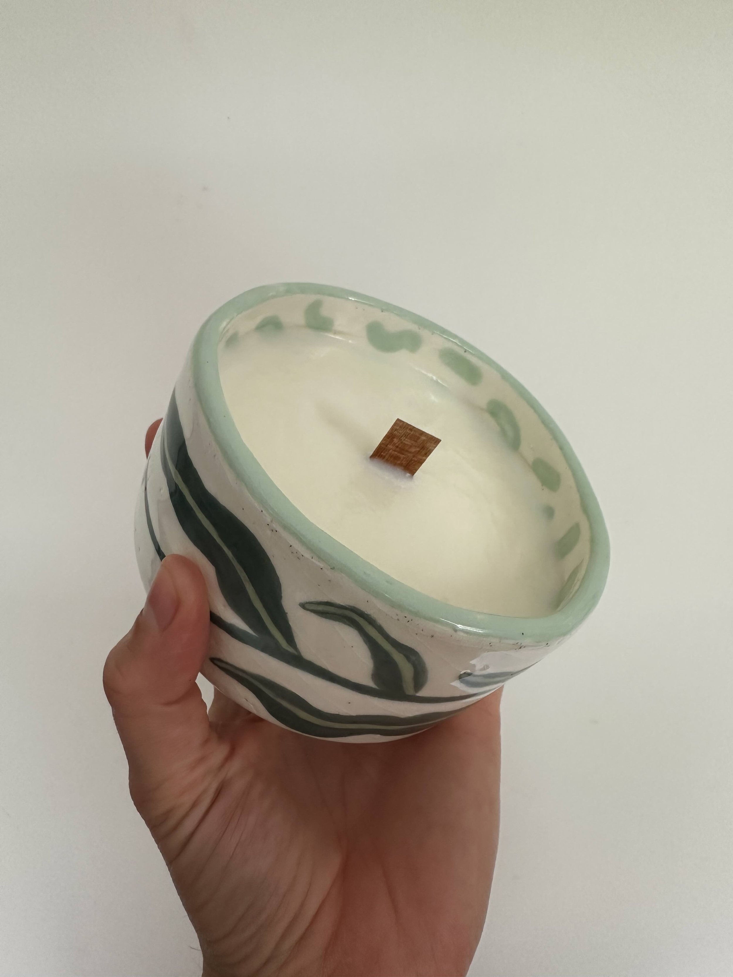 The candle was given to a friend. In fact, she’s been patiently waiting for me to finish it for about a year. I used soy wax that I actually was given from the guy who works at our local chicken shop around the corner from my pottery studio. One evening I was picking up chicken for dinner and as I waited for the food to cook, I popped into the pottery studio and picked up some cups, I mentioned to the ever so friendly man behind the counter that I was going to turn one of the pieces into a candle. A huge smile spread over his bearded face as he told me that he had made a candle for his mum the previous mothers day… and in fact, he had some wax left over if I wanted it.