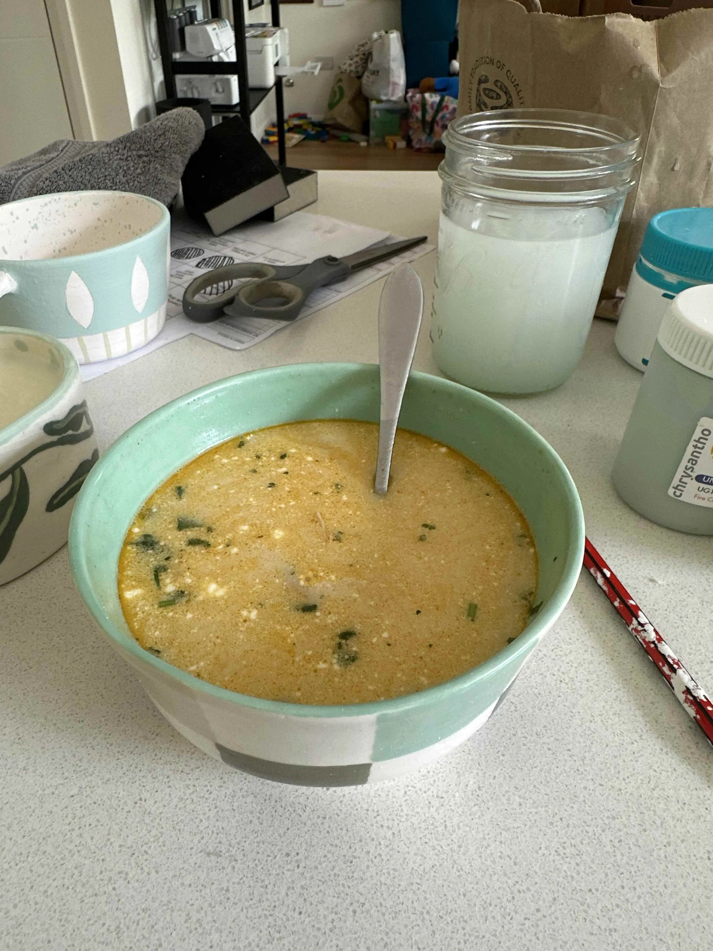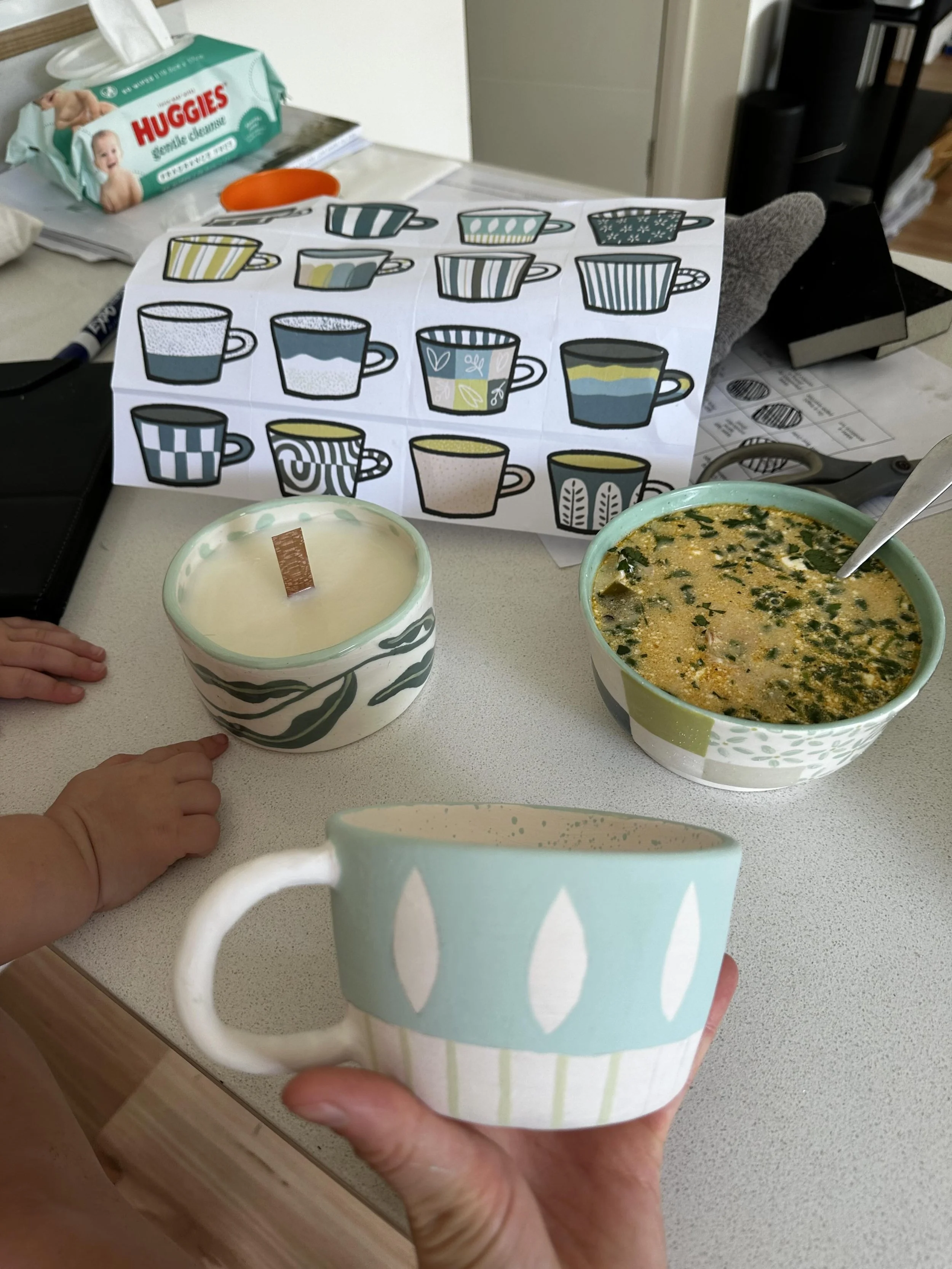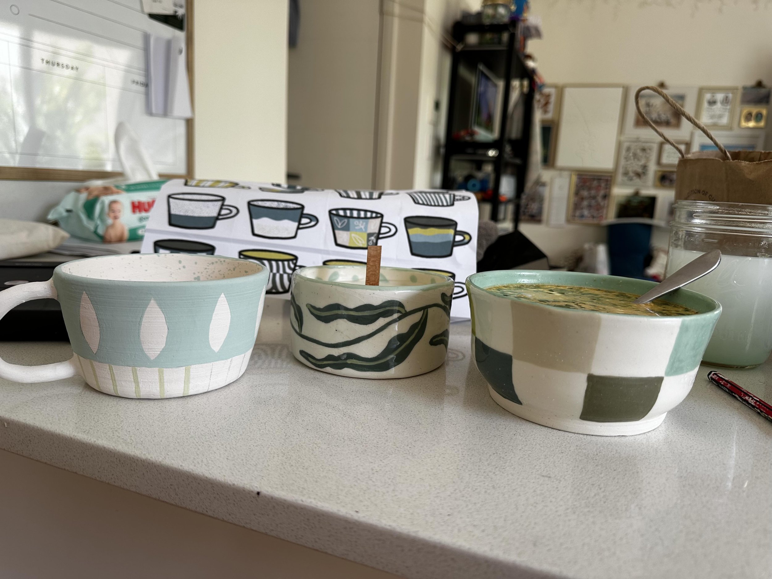 This week I found myself painting one of my pottery pieces at my kitchen island, while slurping homemade white chicken chili from a ceramic bowl I made this year*, all the while looking longingly at a freshly poured candle that was setting in front of me in hopes that the wick would actually work despite the iffy reviews online.