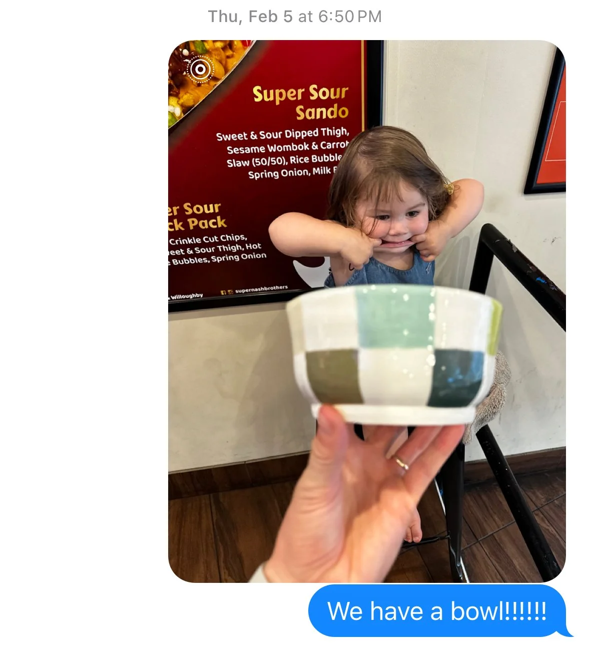 *story time: I have this delightful friend, Katlyn, whom I was able to get addicted to pottery at the same studio I go to. A month ago as we found ourselves giggling and throwing pots I had this idea: Let’s have a girls night where we make dinner and the only dishes we are allowed to eat from are pieces we made at the pottery studio THIS year. As piece after piece is pulled from the kiln, each of us excitedly sends a photo to the other announcing the sort of food we will be eating from it. This was the photo she received when I picked up the finished bowl, naturally Tilly and I went to the chicken shop to celebrate, jk I just didn’t want to cook.